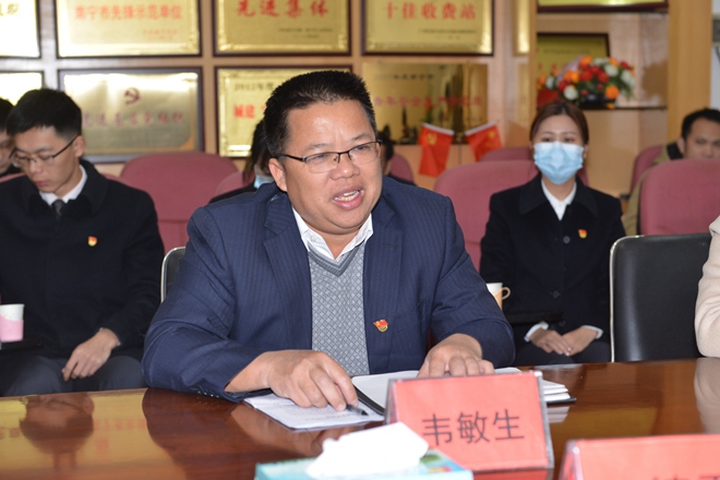 會上,韋敏生書記介紹了南寧路橋公司黨總支部的黨員情況及公司業務發展。他說,總支部目前有黨員69人,下設黨支部3個,分別為南寧城市路橋投資管理有限責任公司機關黨支部、南寧中州投資有限公司黨支部、廣西路邦石化有限公司黨支部。他表示,雙方要以“雙強六好”為目標開展黨組織共建活動,充分發揮黨組織的自身優勢,拓展和完善黨組織功能,定期交流黨建工作經驗,共享黨建工作信息,提高黨建工作水平。