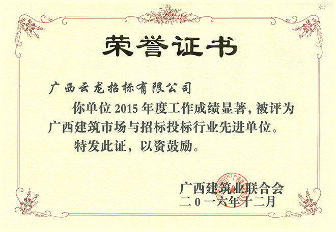 日前,廣西建筑業聯合會建筑市場與招標投標研究分會2016年年會暨表彰大會在南寧隆重召開,廣西云龍招標集團有限公司連續六年榮獲“廣西建筑市場與招標投標行業先進單位”榮譽稱號。同時,陳冰冰、林麗珠、陳超亮、蔣桂蘭、龍曉紅、勞傭維、韋成曉、高瑾、余暉共八位員工榮獲“廣西建筑市場與招標投標行業先進個人”稱號。