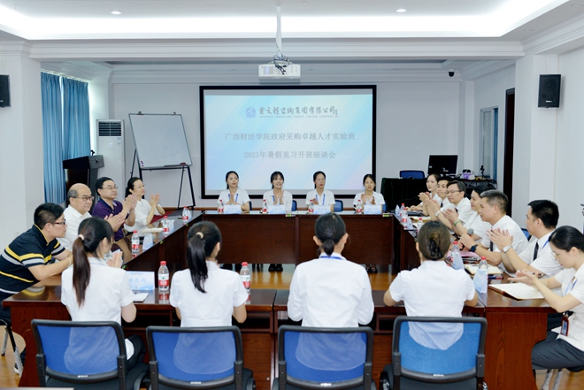 當天,廣西財經學院財政與公共管理學院院長蒙強、副院長藍相潔、系主任宋哲、教師王英一行來到云之龍集團,與實習生共同召開暑期實習開班座談會。云之龍集團總裁王鐿霖、副總裁莫國華以及云之龍學校校長韋明劍等人參加會議。