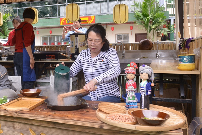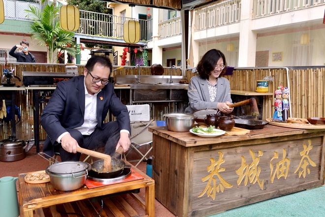 活動當天,黨員同志在社區(qū)工作者的帶領(lǐng)下學習非遺油茶的制作,先將茶葉輕輕翻炒,然后加入蔥、姜一起捶打,直至水分蒸發(fā),炒出香味,再加入熱水煮沸,最后過濾茶葉,一碗香噴噴的油茶就做好啦。